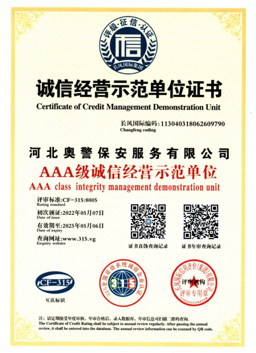 “忠誠的伙伴,非凡的朋友”,河北奧警保安服務(wù)有限公司本著“客戶的需求就是我們的追求”的服務(wù)理念,與廣大客戶攜手并進、共創(chuàng)恢弘偉業(yè)。